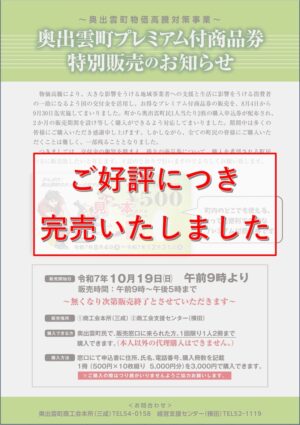 10月19日(日)より特別販売を行っておりました、プレミアム付き商品券は販売予定数に達し、完売となりました。