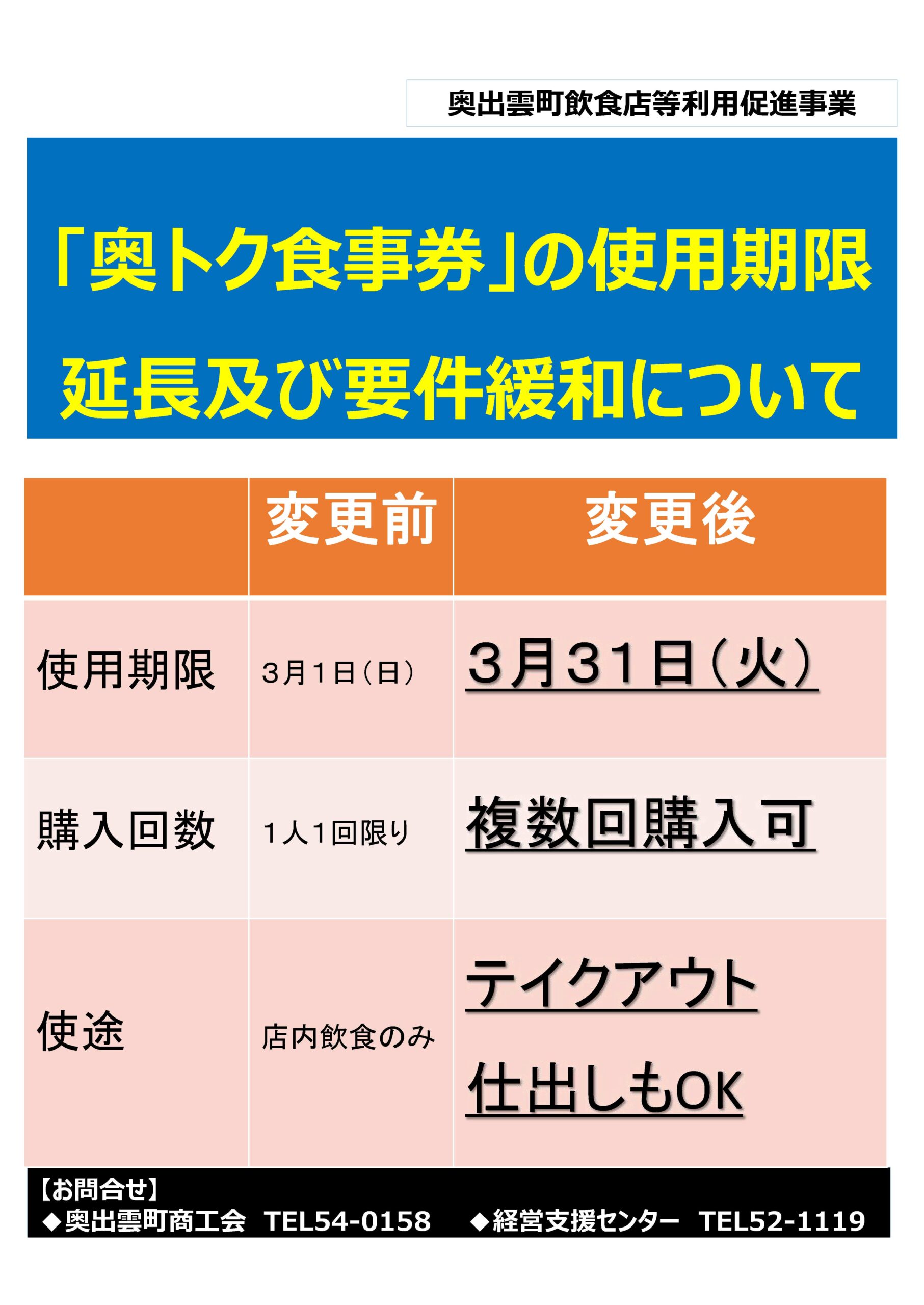 NEW 重要 2026-02-25 【奥トク食事券】 利用期間を延長します! 地域の美味しいお店を応援! 奥出雲 奥トク食事券! 【ご利用可能店舗一覧】 下記にて食事券を販売しております。残りわずかですので、お早めにお買い求めください。 ① 奥出雲町商工会 本所(奥出雲町三成324-15) ② 奥出雲町商工会 経営支援センター(奥出雲町横田992-2) 土日祝を除く9:00~17:00