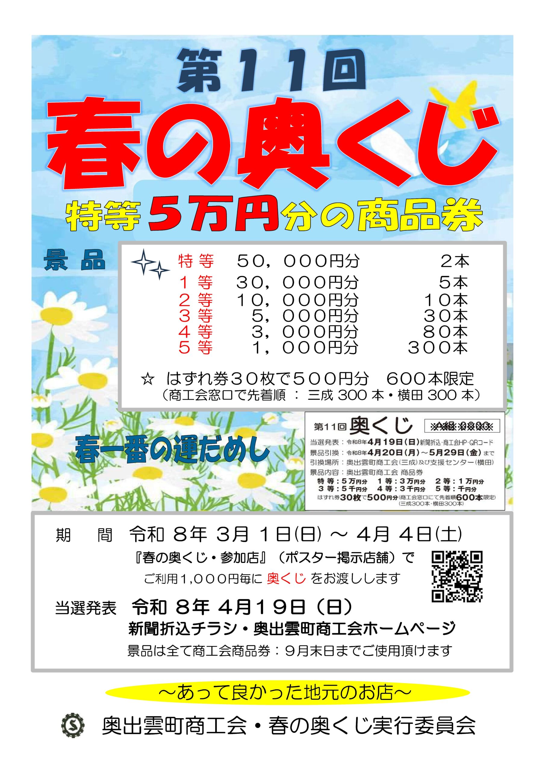 NEW 重要 イベント 2026-02-28 【奥出雲町】今年も「春の奥くじ」を実施します!! 恒例の「第11回春の奥くじ」を下記のとおり実施します。 期間:令和8年3月1日(日)~ 4月4日(土) 当選発表:令和7年4月19日(日) 詳しくはチラシをご覧下さい。